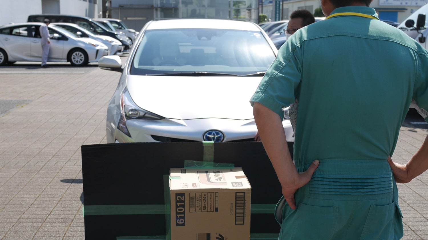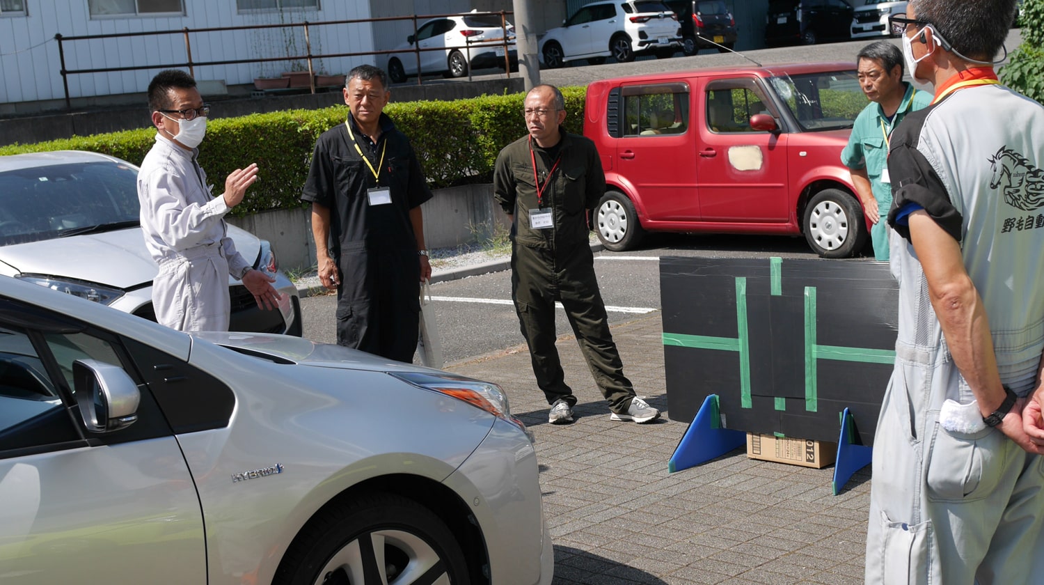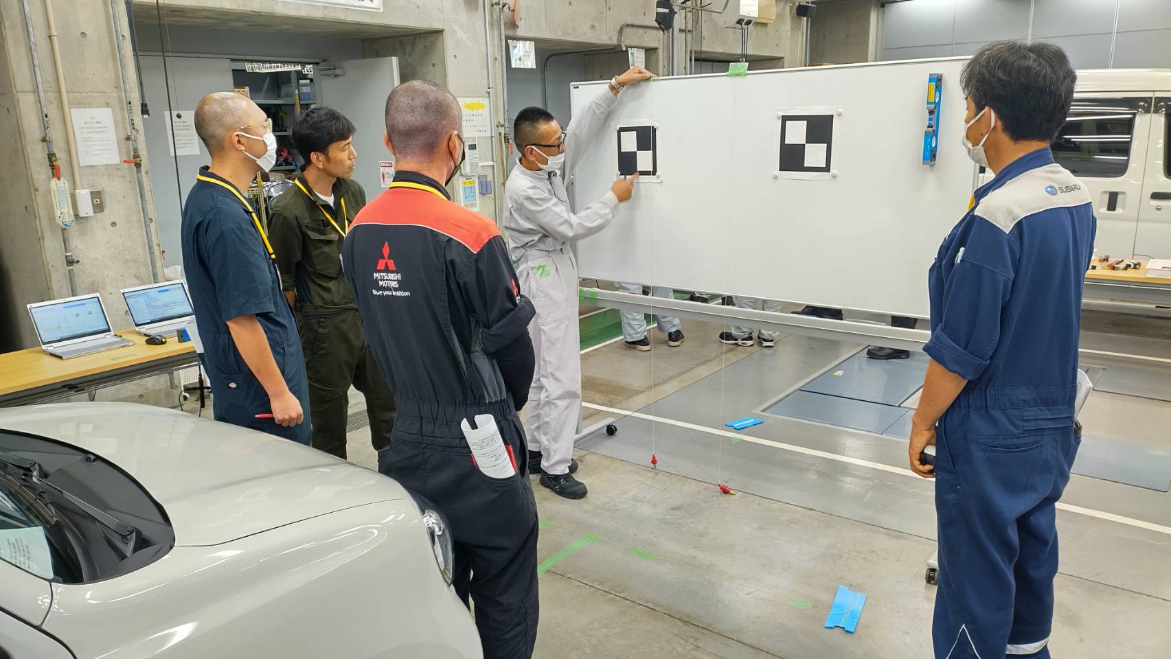 エーミング(調整)作業について、各種ターゲットの作成及び設置方法の説明、車両中心線の出し方など実車を使った研修を行います。